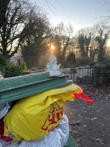 vor zwei Wochen war ich zu einem Konvent kirchlicher Mitarbeiter:innen eingeladen. Thema war das kirchliche Engagement für Demokratie im Wahljahr 2026. Auf dem Weg zum Pfarrhaus begegnete mir dieser Engel. Abgelegt auf einem Müllcontainer blickt er in die Morgensonne. Seinen Platz auf dem Friedhof musste er räumen. Er wurde wohl nicht mehr gebraucht und entsorgt.