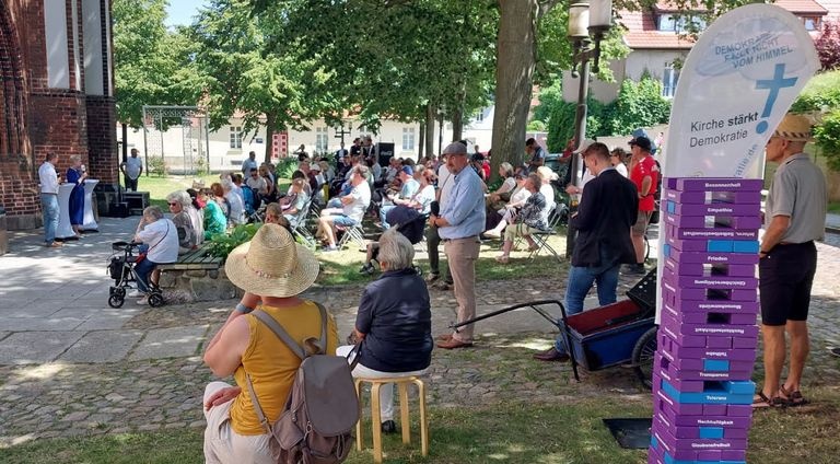 Auch "Kirche stärkt Demokratie" war mit einem Stand vertreten. Der Demokratie-Jenga-Turm wurde als interaktive Diskussionseinladung gut angenommen und es gab zahlreiche intensive Gespräche, u.a. mit der Ministerpräsidentin Manuel Schwesig (SPD).