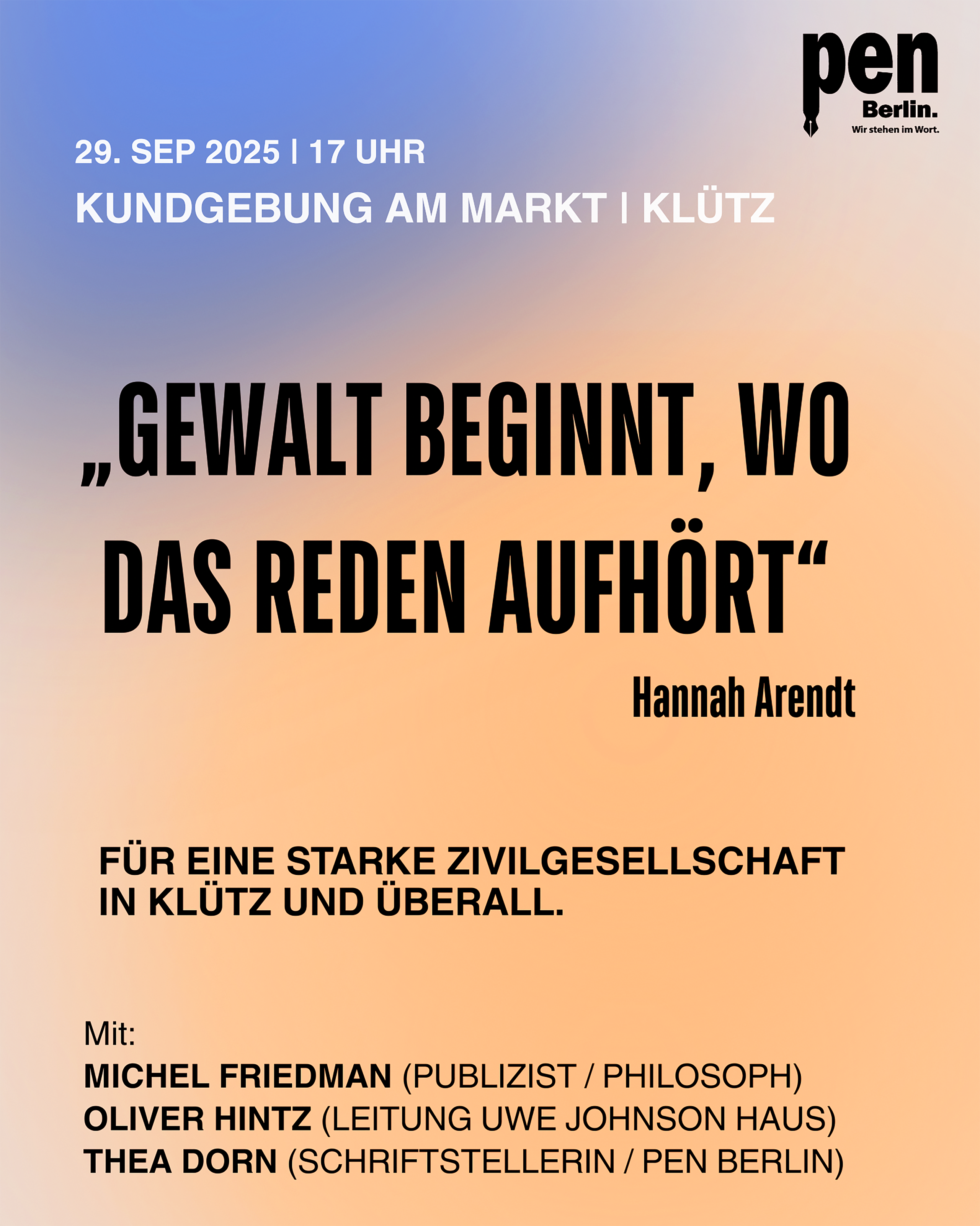 Die Ausladung unseres Gründungsmitglieds Michel Friedman von einem Auftritt im Literaturhaus Uwe Johnson in Klütz (Mecklenburg-Vorpommern) hat zu Irritationen geführt – auch bei uns, der Autorenvereinigung PEN Berlin. Wir bedauern, dass die für den Oktober 2026 anlässlich des 120. Geburtstags von Hannah Arendt geplante Veranstaltung abgesagt wurde.